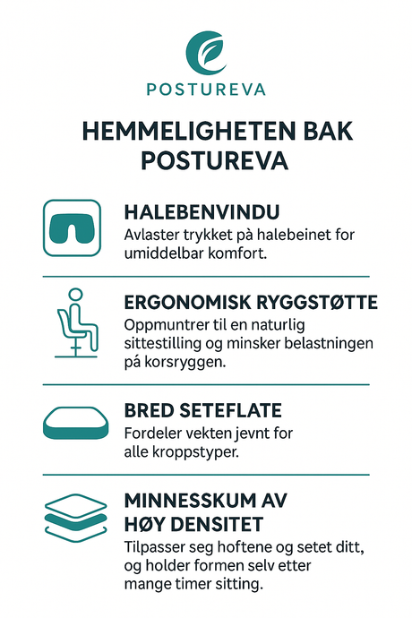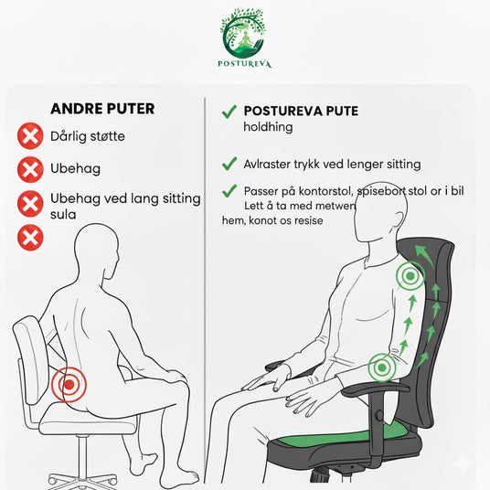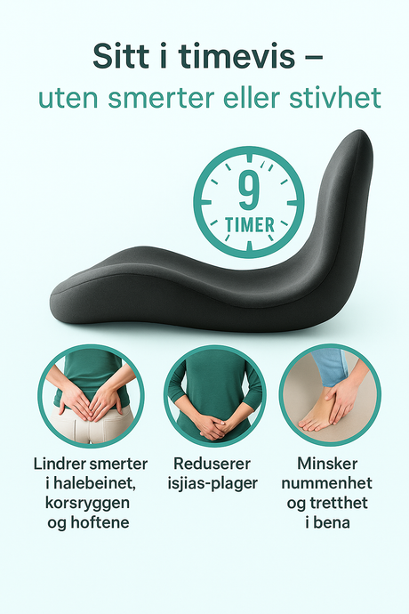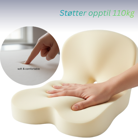 Vår ergonomiske sittepute reduserer trykk på haleben og hofter, og hjelper kroppen inn i en mer naturlig og behagelig sittestilling – enten du sitter på kontoret, i bilen eller hjemme ved spisebordet.